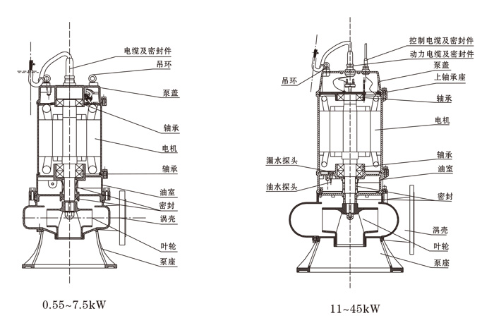 2、無(wú)內(nèi)自流循環(huán)冷卻系統(tǒng)的泵,電機(jī)部分露出液面不得超過電機(jī)的1/2.